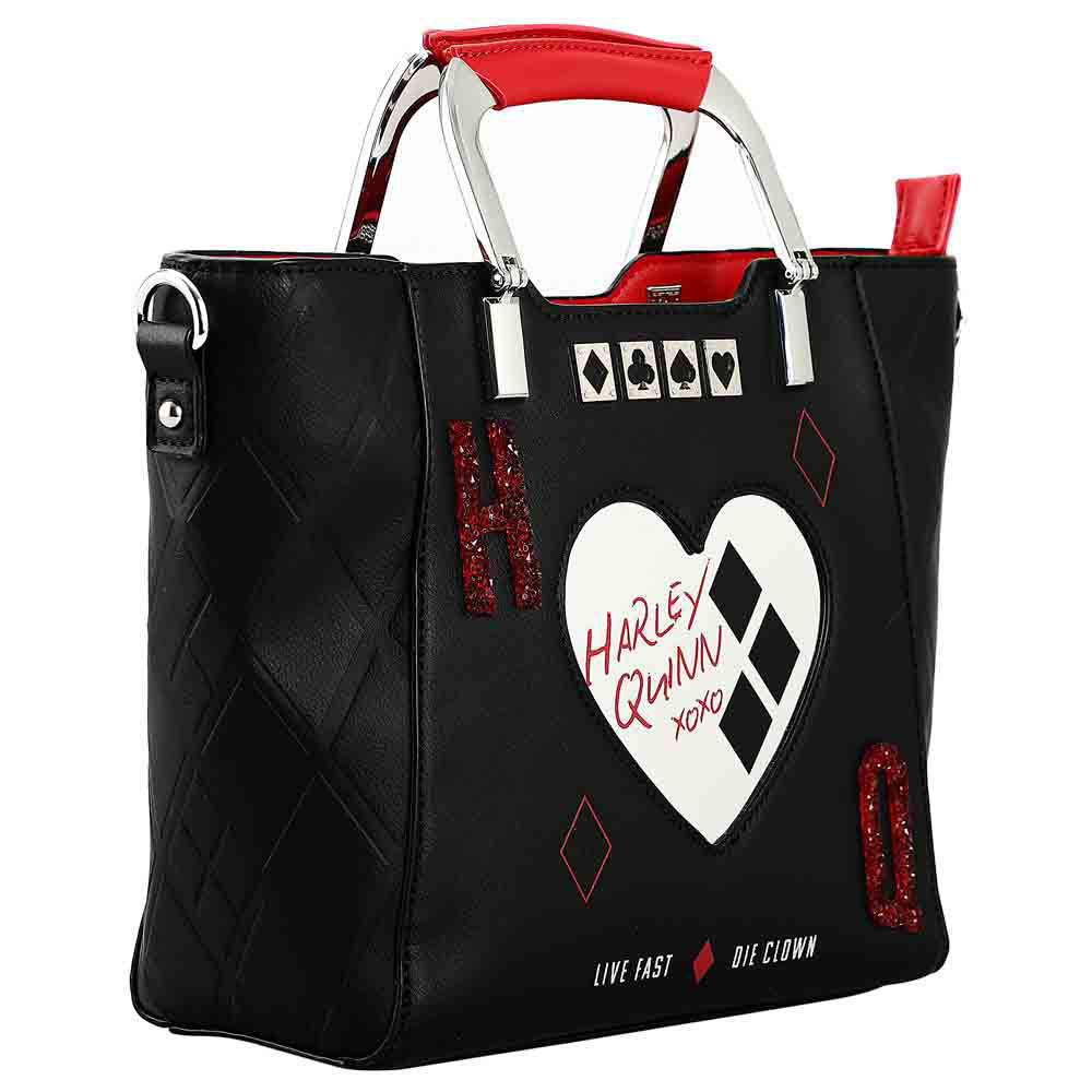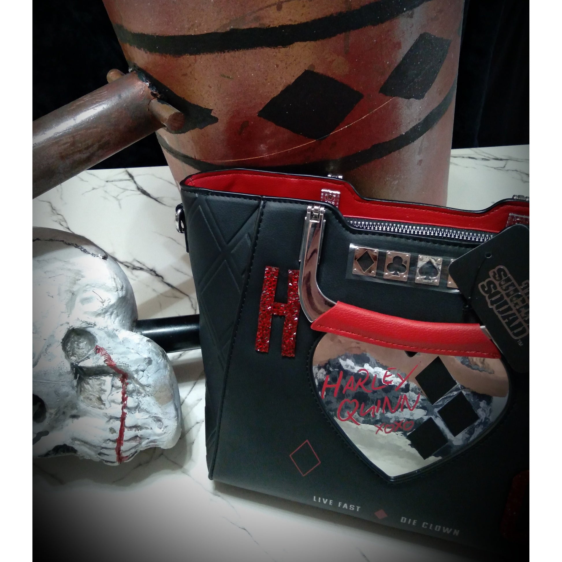 The DC Comics Suicide Squad Harley Quinn Metallic Heart Handbag is a stylish and eye-catching accessory that is perfect for fans of the popular comic book series and the movie.